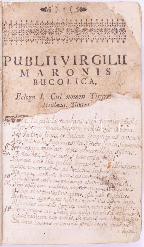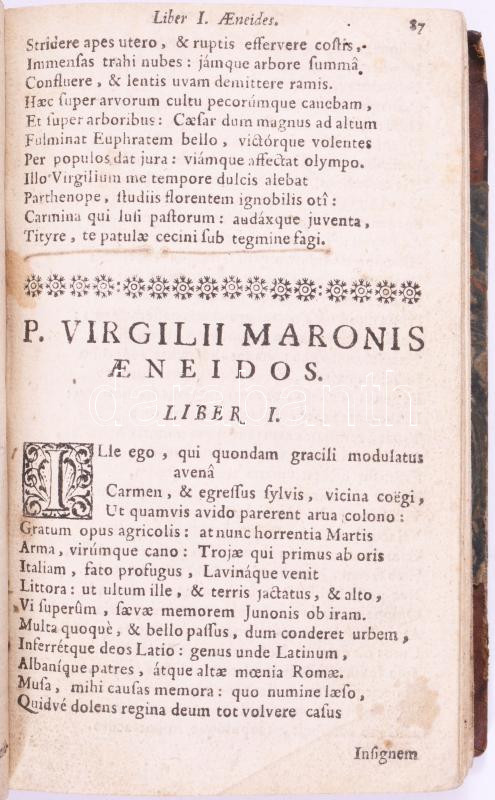 XVIII. század közepe - második fele Publius Vergilius Maro művei: Publii Virgilii Maronis Bucolica: Ecologa I-X, Publii Virgilii Maronis Georgicorum, Publii Virgilii Maronis Aeneidos: Liber I-XII. hn., én., nyn., 368 p. Latin nyelven. Az elülső szennylapon 1805-ös possessori bejegyzéssel. Korabeli félbőr-kötésben, kopott borítóval, hiányzó címlappal, az első lap nagyrésze hiányzik, a szöveget kézzel pótolták.