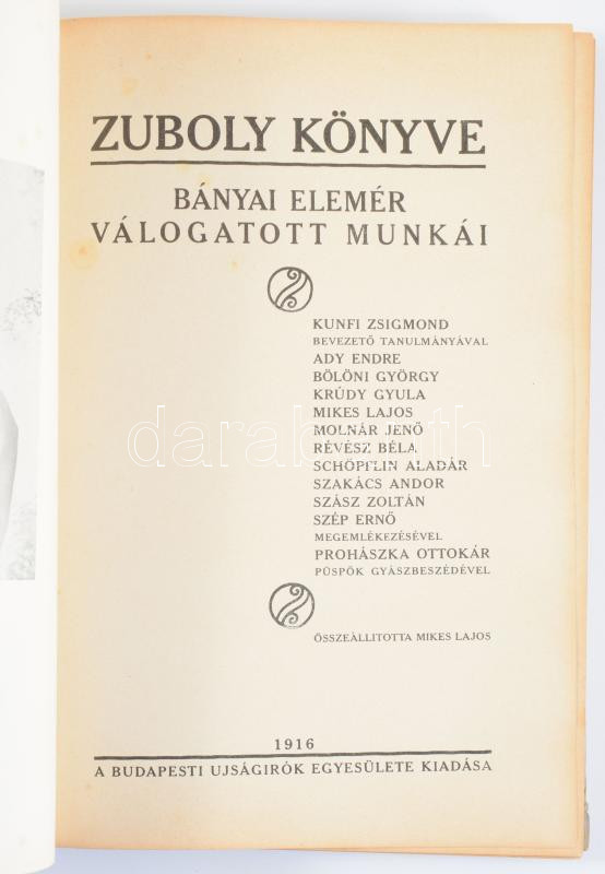 Leírás: Zuboly könyve. Dr. Bányai Elemér válogatott munkái. Összeáll.: Mikes Lajos.Bp., 1916, Budapesti Újságírók Egyesülete. Kiadói vászonkötésben