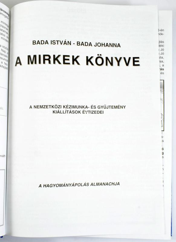 Leírás: Bada István - Bada Johanna: A MIRKek könyve. A Nemzetközi Kézimunka- és Gyűjtemény Kiállítások évtizedei. A hagyományápolás almanachja. Bp., 2005, Örömforrás Média-Művészeti Bt., 427+[1] p. Fekete-fehér és színes fotókkal illusztrálva. Kiadói kartonált papírkötés.