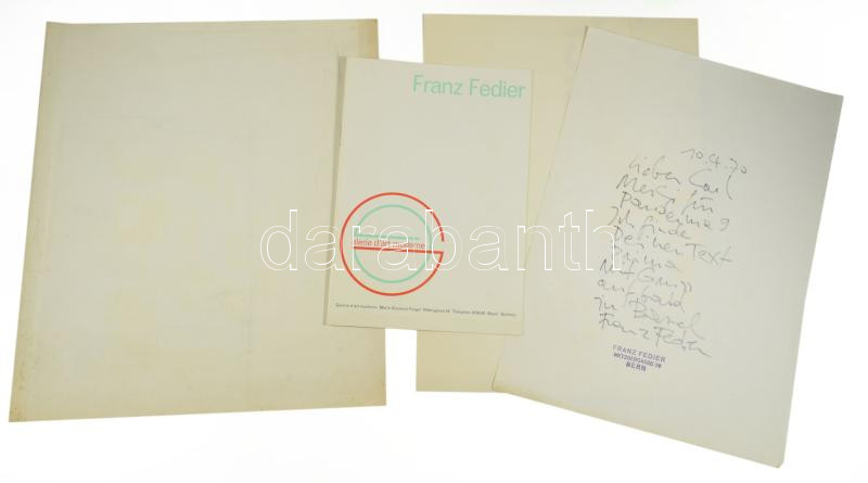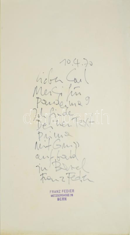 1970 Franz Fedier (1922?2005) svájci művész autográf sorai és aláírása egy papírlapon, bélyegzésével.