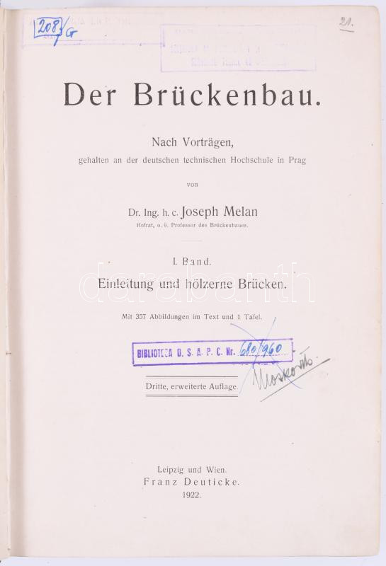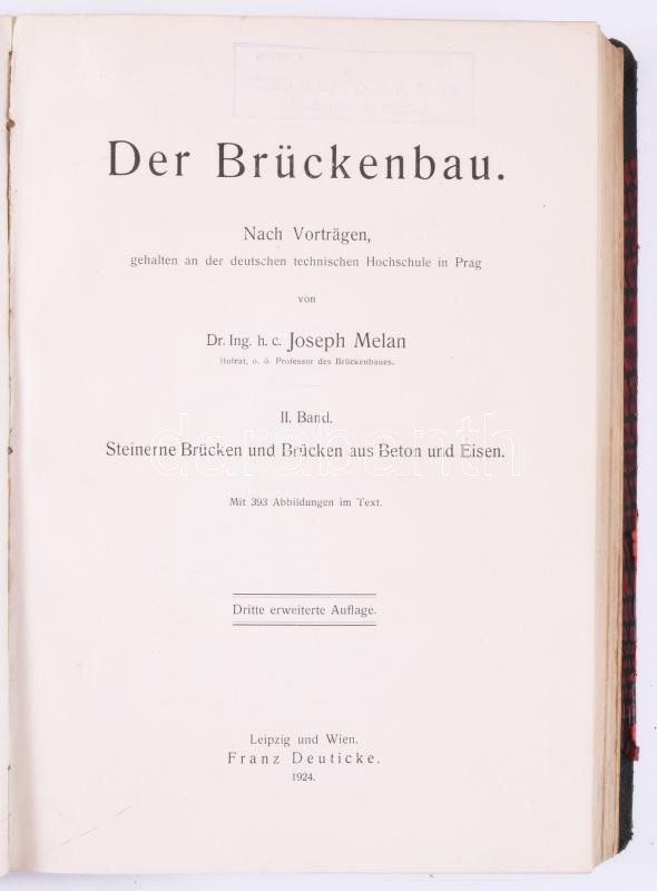 Joseph Melan: Der Brückenbau. Nach Vorträgen, gehalten an der deutschen technischen Hochschule in Prag. Bände I-II. I. Band: Einleitung und hölzerne Brücken. II. Band: Steierne Brücken und Brücken aus Beton und Eisen. [Melan, Joseph: Hídépítés I-II. kötet. I. kötet: Bevezetés és fahidak. II. kötet: Kőhidak és beton- és vashidak.] (Egybekötve.) Leipzig - Wien, 1922-1924, Franz Deuticke, VIII+300 p.+1 t.;+IV+459 p. Dritte Auflage. Német nyelven. Fekete-fehér illusztrációkkal. Átkötött félvászon-kötés, kissé kopott borítóval, sérült gerinccel, régi bélyegzésekkel.