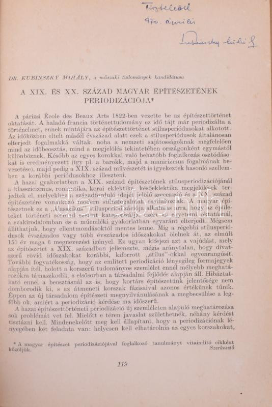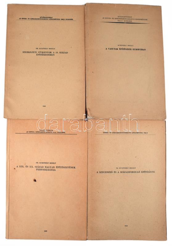 Kubinszky Mihály (1927-2016) Széchenyi- és Ybl Miklós-díjas építész, építészettörténész, vasúttörténész 4 db különlenyomata, közte egy dedikált: A vasutak építészete Európában.; Szerkezeti vívmányok a 19. század építészetében.; A szecesszió és a századforduló építészete.; A XIX. és XX. század magyar építészetének periodizációja (dedikált). Bp., 1961-1970, Akadémiai Nyomda. Kiadói papírkötés, vegyes állapotban.