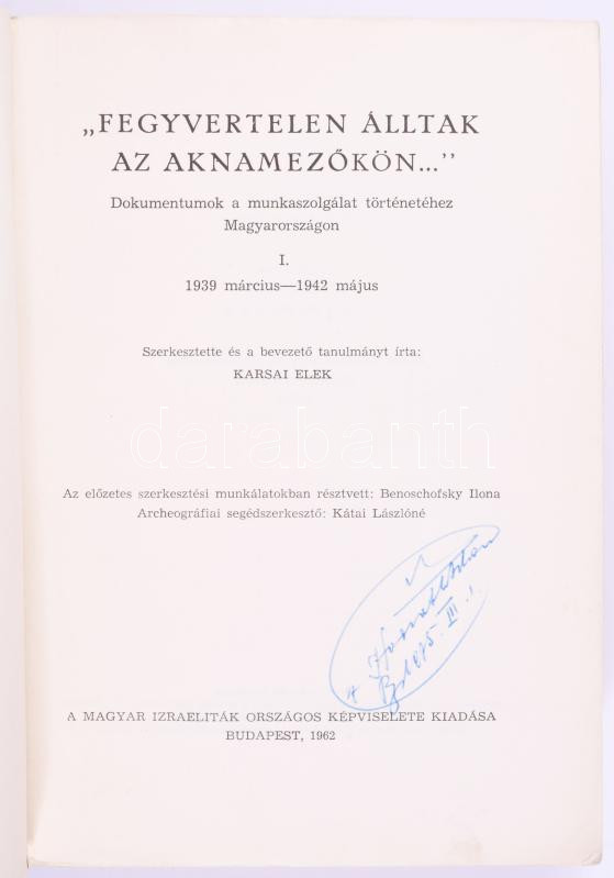 Karsai Elek (szerk.): "fegyvertelen álltak az aknamezőkön"... Dokument... https://www.darabanth.com/hu/518-Filatelia-kepeslap-numizmatika-mutargy-konyv-papirregiseg-ekszer-aukcio/524.0/Konyvek/Konyvek-Judaika~130/Karsai-Elek-szerk-fegyvertelen-alltak-az-aknamezokon-Dokumentumok-a-munkaszolgalat~II3519796