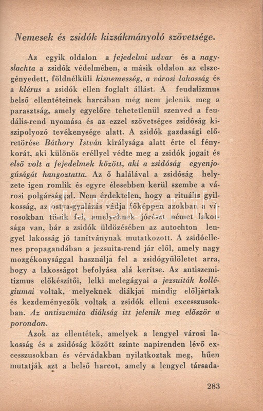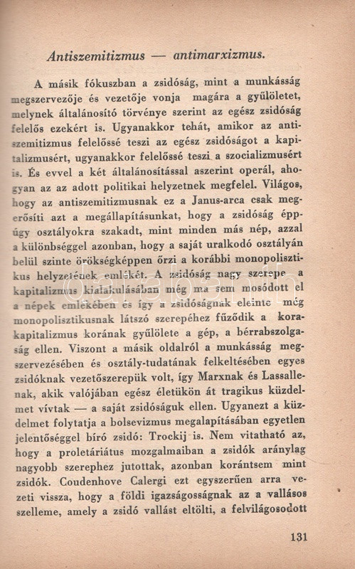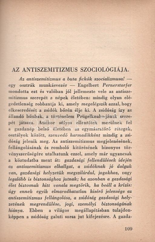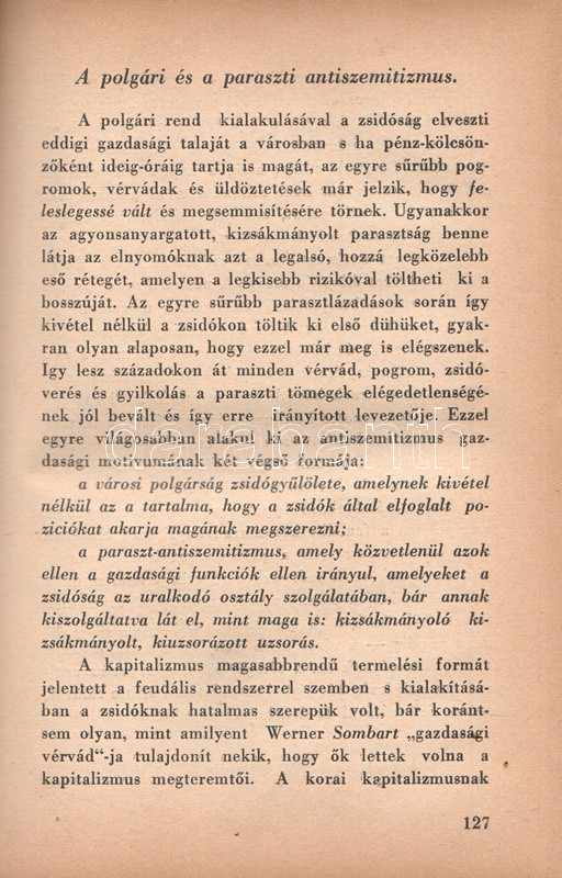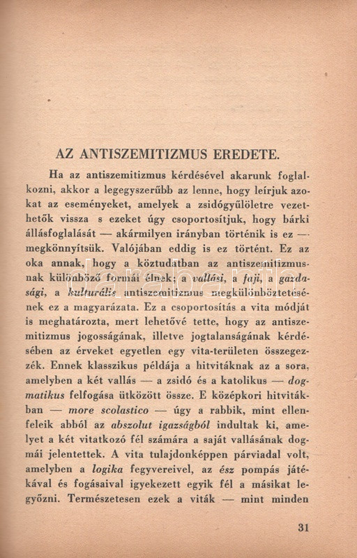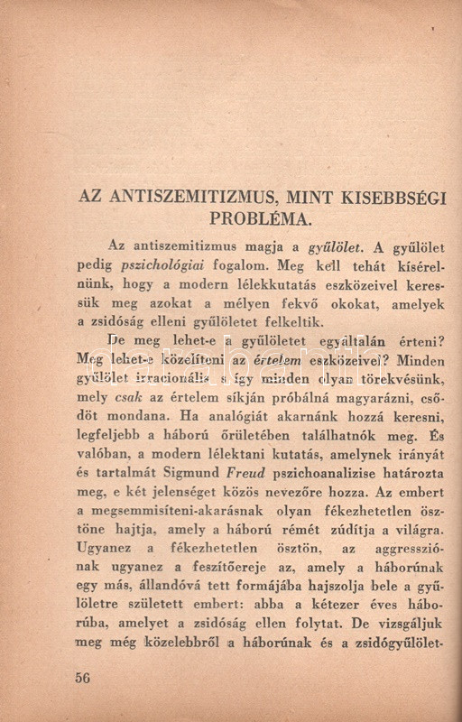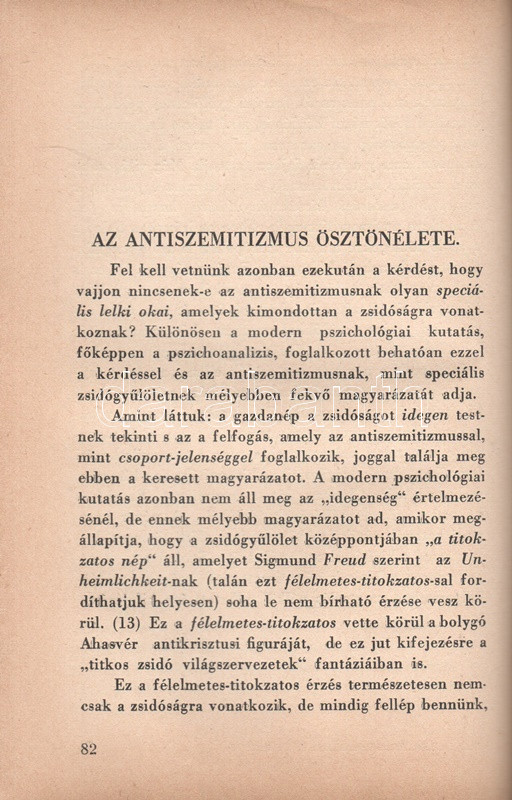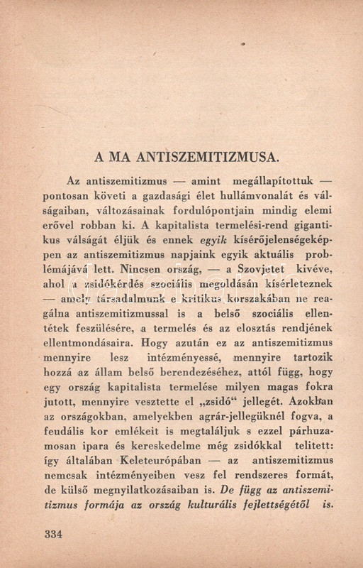 Székely Béla: Az antiszemitizmus és története. Budapest, (1936) A ,,Tabor" kiadása (Hungária Nyomda Rt.) 382 + [2] p. Egyetlen magyar kiadás. Székely Béla (1891-1955) költő, újságíró, mélylélektani szakíró, az Emberismeret nevű pszichológiai és grafológiai lap szerkesztője. Szociálpszichológiai szakmunkája a zsidóságot sújtó előítéletek mélylélektani alapjait, illetve történetét nyomozza az ókortól a kortárs időkig. A kötet a szerző fordításában később portugál nyelven is megjelent. Az első nyomtatott oldalon régi tulajdonosi bejegyzés. Aranyozott, sérült, enyhén hiányos gerincű kiadói félbőr kötésben.