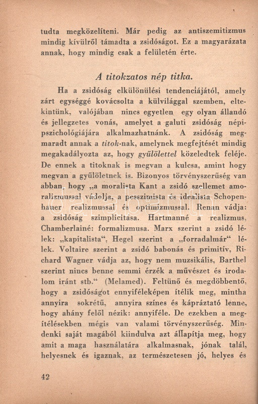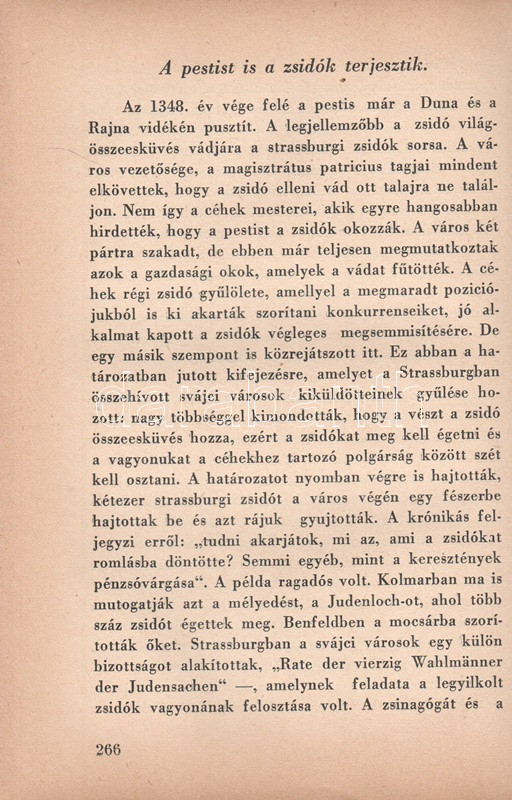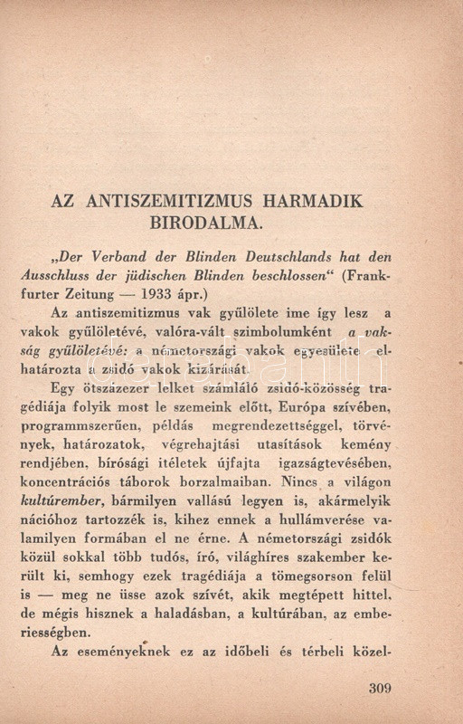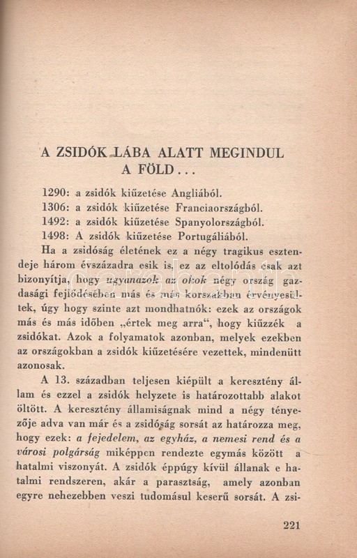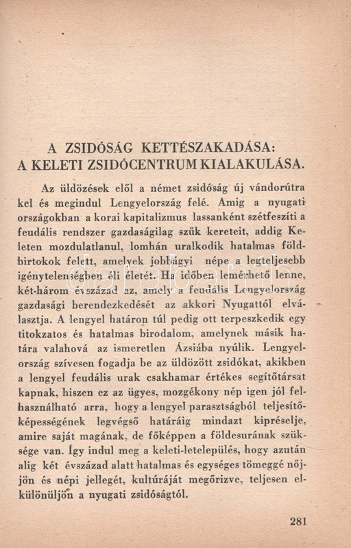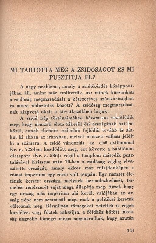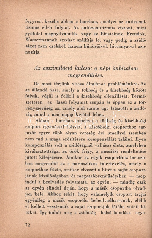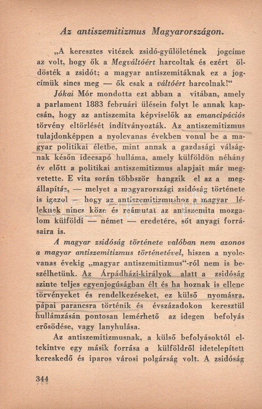 Székely Béla: Az antiszemitizmus és története. Budapest, (1936) A ,,Tabor" kiadása (Hungária Nyomda Rt.) 382 + [2] p. Egyetlen magyar kiadás. Székely Béla (1891-1955) költő, újságíró, mélylélektani szakíró, az Emberismeret nevű pszichológiai és grafológiai lap szerkesztője. Szociálpszichológiai szakmunkája a zsidóságot sújtó előítéletek mélylélektani alapjait, illetve történetét nyomozza az ókortól a kortárs időkig. A kötet a szerző fordításában később portugál nyelven is megjelent. Az első nyomtatott oldalon régi tulajdonosi bejegyzés. Aranyozott, sérült, enyhén hiányos gerincű kiadói félbőr kötésben.