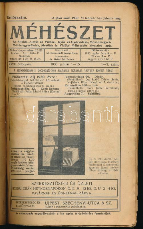 1930 Méhészet, az Alföldi-, Alcsút és Vidéke-, Győr és Győrvidéki-, Mosonmegyei- Méhészegyesületek, Mezőtúr és Vidéke Méhészkör hivatalos lapja XXVII. évf. 1-24. sz. (teljes évfolyam), 1930. jan. 1. - dec. 15. Szerk.: id. Boczonádi Szabó Imre, Örösi Pál Zoltán. Egybekötve, viseltes állapotban, helyenként foltos, kissé sérült lapokkal.