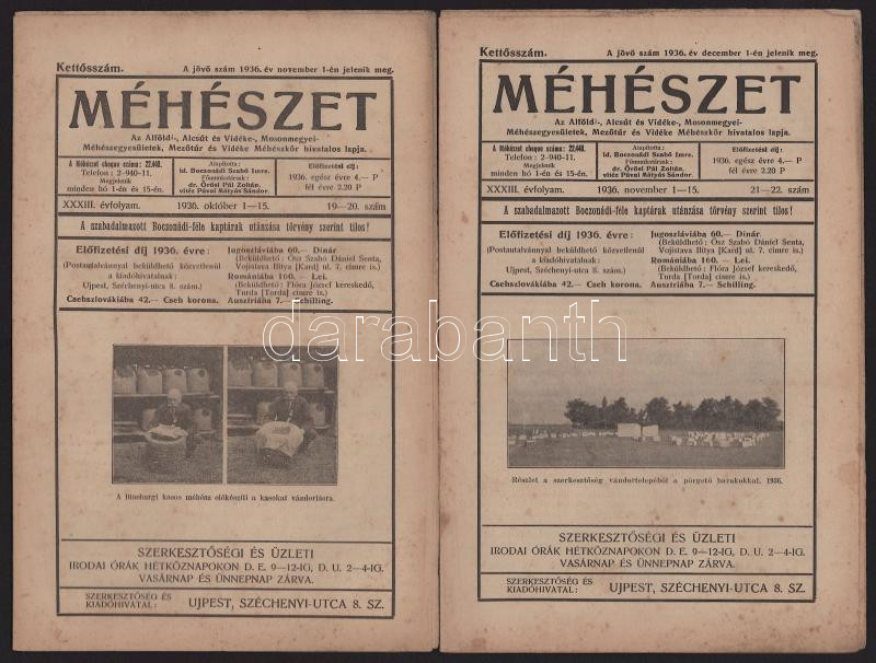1936 Méhészet, az Alföldi-, Alcsút és Vidéke-, Mosonmegyei- Méhészegyesületek, Mezőtúr és Vidéke Méhészkör hivatalos lapja XXXIII. évf. 15-16., 17-18., 19-20., 21-22. számai (4 db), változó állapotban, részben foltos.