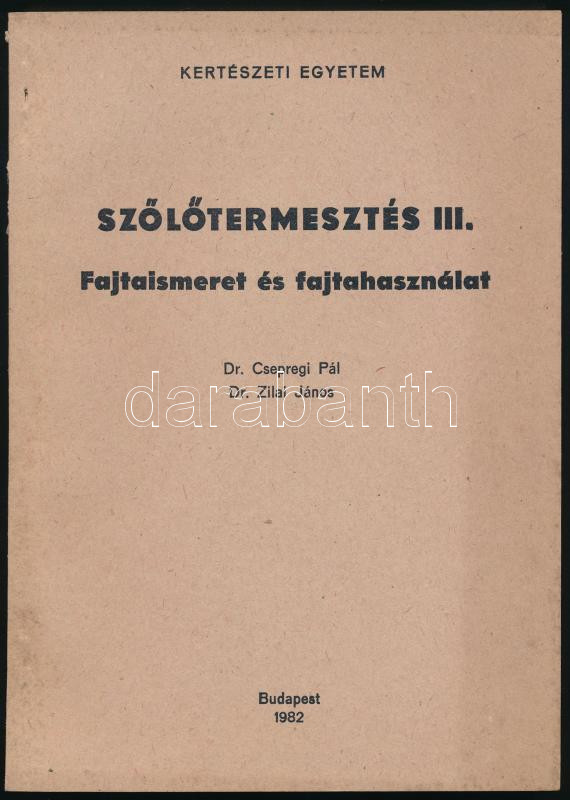Csepregi Pál - Zilai János: Szőlőtermesztés III. Fajtaismeret és fajtahasználat. Bp., 1982, Kertészeti Egyetem, 173+[3] p. Kiadói papírkötés. Megjelent 650 példányban.
