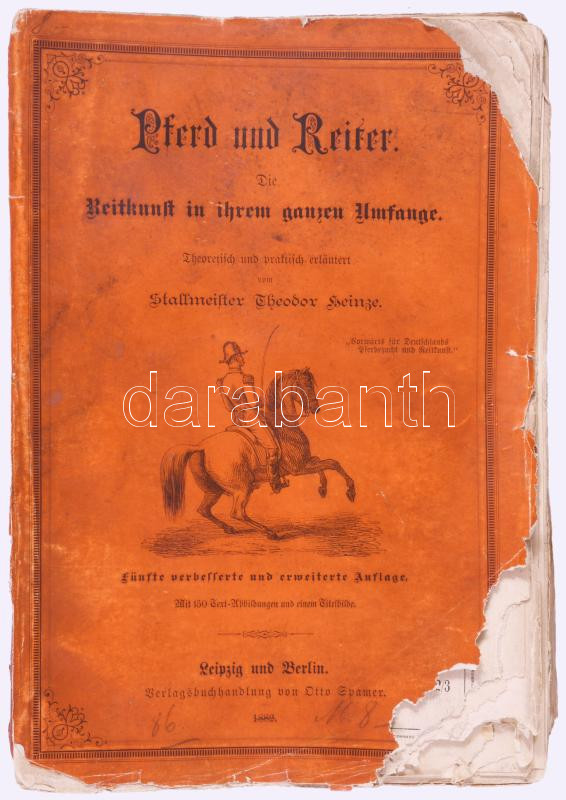 Heinze, Theodor: Pferd und Reiter. Die Reitkunst in ihrem ganzen Umfange. Leipzig-Berlin, 1882, Otto Spamer, XXII+538+[2] p. Német nyelven. Kiadói papírkötés, erősebben sérült, széteső állapotban.