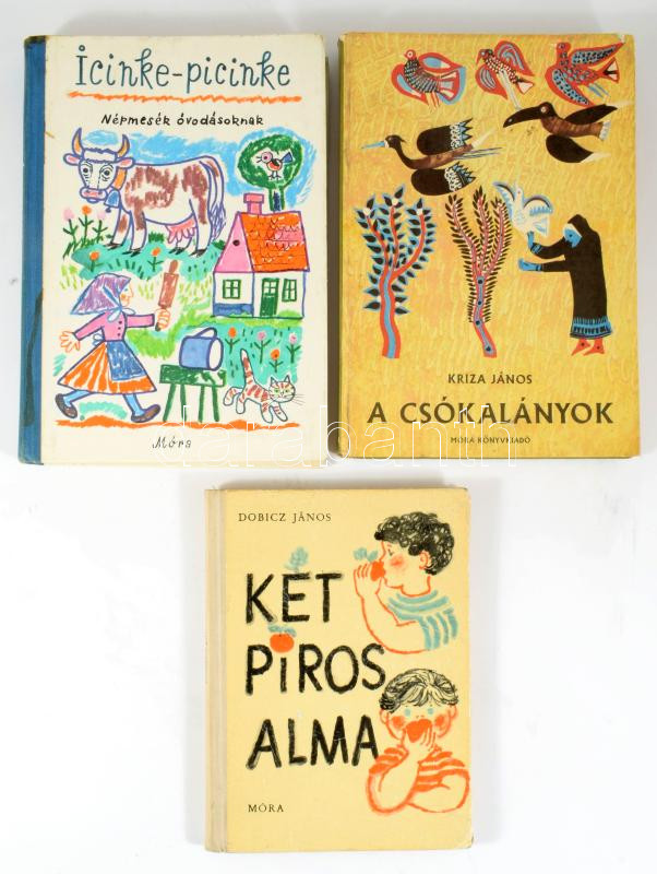 Leírás: 3 db mesekönyv: Dobicz János: Két piros alma.; Icinke-picinke. Magyar népmesék óvodásoknak.; Kriza János: A csókalányok. Bp., 1962-1982, Móra. Kiadói félvászon-kötés / kartonált papírkötés, változó állapotban.
