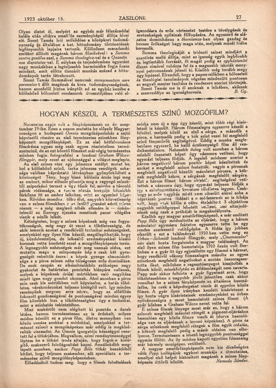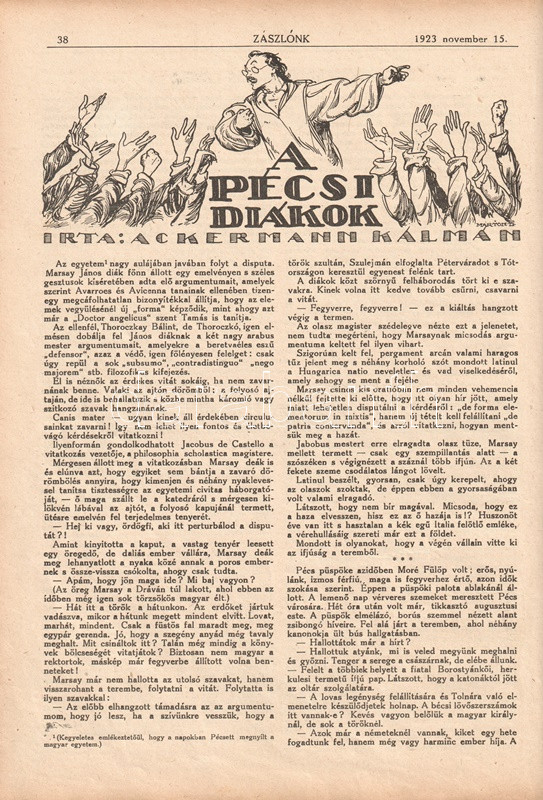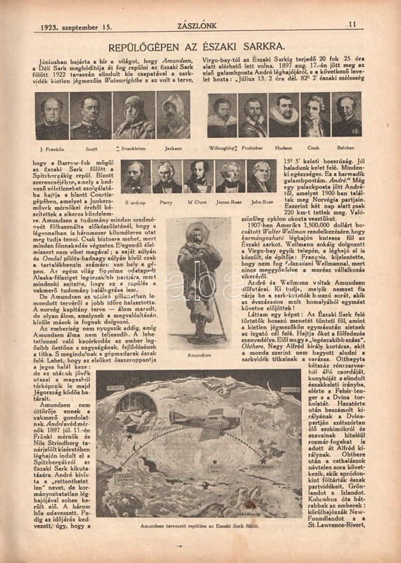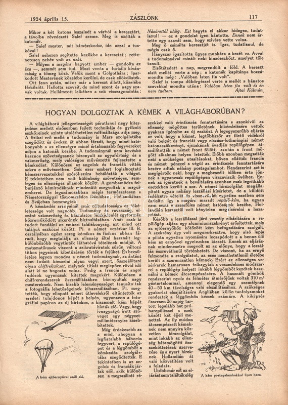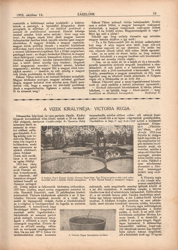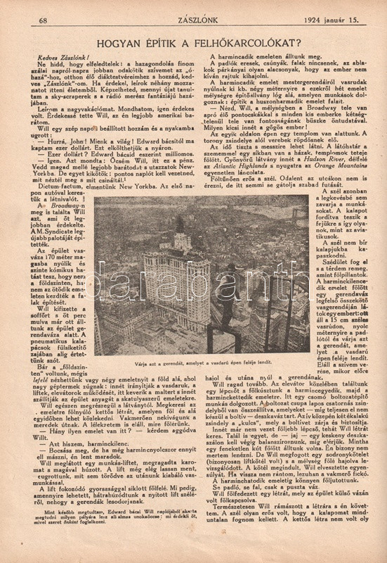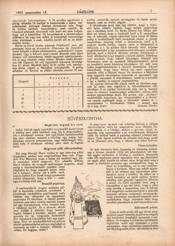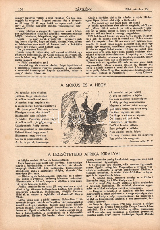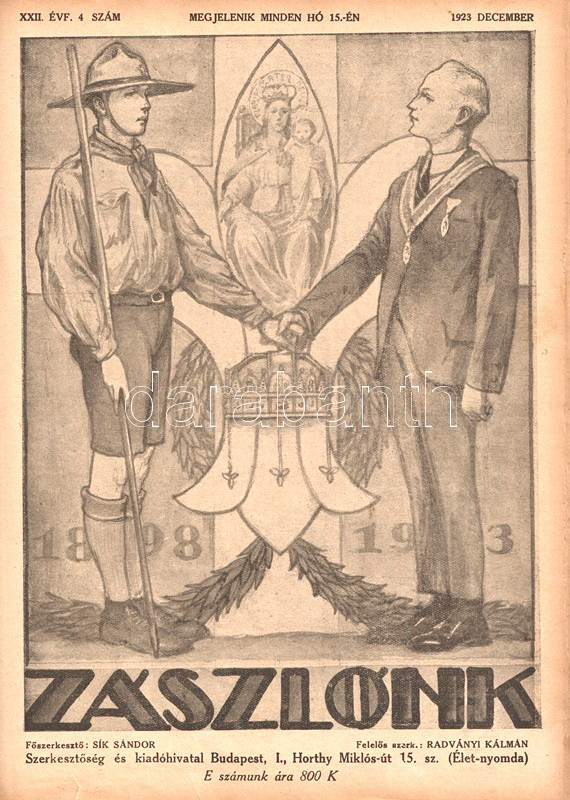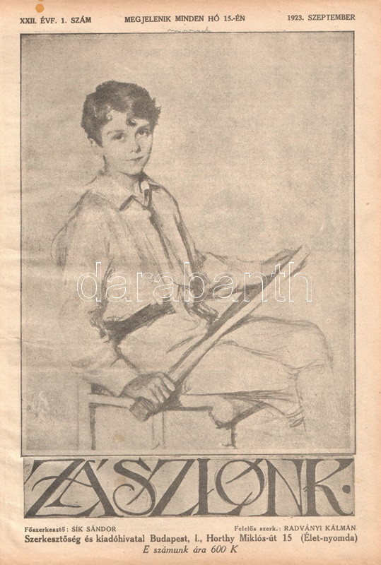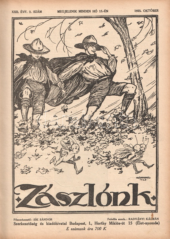 [Folyóirat] Zászlónk. Ifjúsági lap. Felelős szerkesztő: Radványi Kálmán. Megjelenik minden hó 15-én. XXII évfolyam, 1-10. szám. (1923. szeptember 15. -- 1924. június 15.) [Teljes évfolyam, egybekötve.] Budapest, 1923-1924. Regnum Marianum Egyesület (Élet Irodalmi és Nyomda Rt.) 160 p. Az 1902-ben alapított Zászlónk folyóirat katolikus szellemiségű, gazdagon illusztrált ifjúsági lap, mely jelen formájában 1944 novemberéig létezett. A Regnum Marianum által kiadott katolikus ifjúsági lap egyszerre közölt történelmi, honismereti és ismeretterjesztő írásokat; cserkészeti, illetve irodalmi anyagot. A lap a háborús évek múltával visszatért eredeti ifjúsági irodalmi, honismereti, művelődéstörténeti, természettudományi ismeretterjesztő és cserkészeti témáihoz. A trianoni döntés utáni évekből származó ifjúsági évfolyamunk értelemszerűen kiemelten kezeli a határon túl rekedt magyarság sorsát. A lap grafikáit Márton Lajos és Petrasovszky Emmánuel rajzolta. A tartalomból: Palik Ferenc: Vulkán-völgy (tárcaregény) -- A földnélküli Hoichi. Japán legenda -- Ajtay Kálmán: A cserkészzászló (novella) -- Radványi Kálmán: Karcsi az állatvédő egyesület tagja lett. Karcsi psichológiával dolgozik (humoreszkek) -- Radványi Kálmán: Az éjjeli őrök (novella) -- Ackermann Kálmán: A pécsi diákok (novella) -- Ajtay Kálmán: Salef, az ács (elbeszélés) -- Upman a modern diákkonviktusban. Upman az okosak házában (humoreszkek) -- Veni Sancte Spiritus -- Sík Sándor: Hogy is állunk a Jézuskával -- Sajó Sándor: Most jöttem Erdélyből (vers) -- Radványi Kálmán: Regnumi diák (vers) -- Simándy Béla: Hontalan (vers) -- Sajó Sándor: A drégelyi várromon (vers) -- Sík Sándor: Karácsonyi álom (vers) -- Ismeretterjesztő írások: Farkas Gyula: Magyar diákok Berlinben hajdan és most -- Hogyan mulattak a régi pestiek? -- Elnémult harangok. Rákosi Viktorról -- Radványi Kálmán: Hogyan nyaral az amerikai család? -- Repülőgépen az Északi-sarkra -- Balanyi György: Hogyan dolgoztak a kémek a világháborúban? -- Nemoda Sándor: Az ókorban is volt szikratávíró. Hogyan táviratoznak a földrengések? Hogyan készül a természetes színű mozgófilm? Radiotelegrafia és telefonia a mindennapi életben -- Iszlai János. Hogyan építik a felhőkarcolókat? A modern hidak építése. A világítótornyok építése -- A patkós orrú óceánjáró -- A legsötétebb Afrika királyai -- Hadyma Emil: Egy méhecske leleplezései a szabályos hatszögről. Néhány levélen apró szakadásnyom, egy levélen apró, az oldaltükröt nem érintő hiány, néhány oldalon apró lapszéli foltosság. Az első előzéken régi gyűjteményi bélyegzés. Lakatos 4546. Poss.: II. kerületi ferences kölcsönkönyvtár. Korabeli félvászon kötésben. Jó példány.