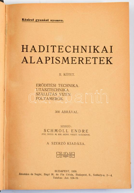 Leírás: Schmoll Endre: Haditechnikai alapismeretek. II. köt. Erődítési technika. Utásztechnika. Szállítás vizen. Folyamerők. Bp., 1930., Szerzői, XVI+575 p. Szövegközti ábrákkal. Átkötött félvászon-kötés, kopott, foltos borítóval.