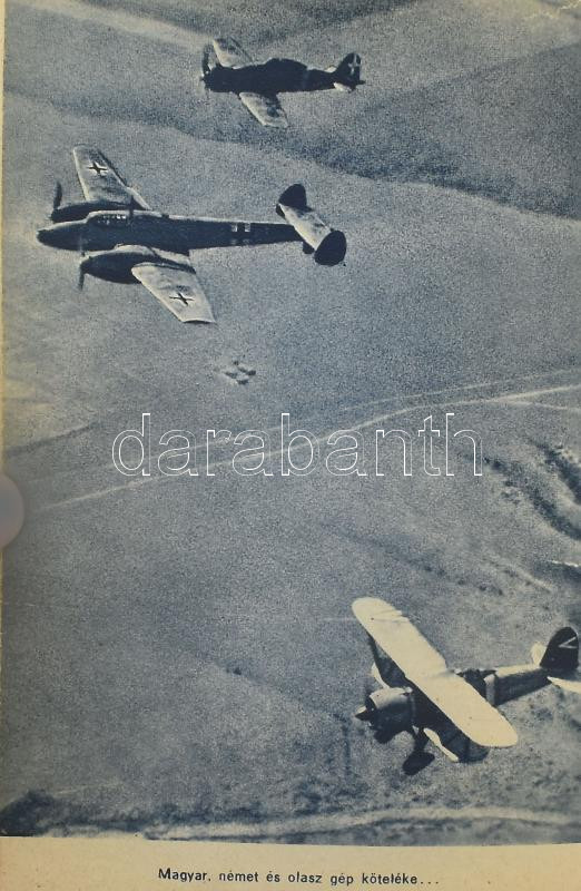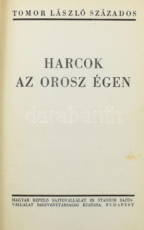 Tomor László: Harcok az orosz égen. Betiltott! Szerepel az Ideiglenes Nemzeti Kormány által 1945-ben betiltott fasiszta, és szovjetellenes könyvek jegyzékén! A repülő ember I. köt. Bp.,[1942], Magyar Repülő Sajtóvállalat-Stádium, 162 p.+8 (fekete-fehér képtáblával) t. Kiadói félvászon-kötés, kopott borítóval.