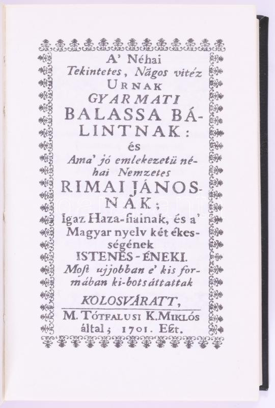 Balassa Bálint és Rimai János istenes éneki. Szabó Géza tanulmányával. (Minikönyv). Bp., 1983, Helikon. Hasonmás kiadás, kÃsérÅ‘tanulmánnyal. Kiadói aranyozott egészbÅ‘r-kötés, kiadói kartontokban, jó állapotban.