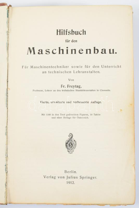 Freytag, [Friedrich]: Hilfsbuch für den Maschinenbau. Für Maschinentechniker sowie für den Unterricht an technischen Lehranstalten. Berlin, 1912, Julius Springer, XVI+1236 p.+ 10 (kihajtható) t. Szövegközti és egészoldalas ábrákkal illusztrálva. Német nyelven. Kiadói aranyozott egészvászon-kötés, egy kissé sérült, kijáró lappal.