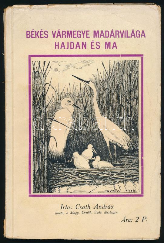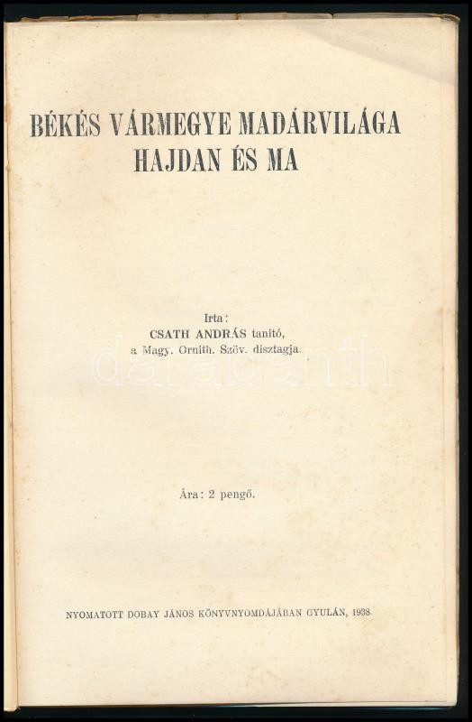 Csath András: Békés vármegye madárvilága hajdan és ma. Gyula, 1938, Dobay János. Kiadói papírkötés, kopottas állapotban.