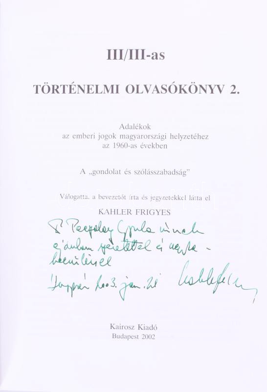 Kahler Frigyes: III/III-as történelmi olvasókönyv. Adalékok az emberi jogok magyarországi helyzetéhez az 1960-as években. 1-2. köt. Vál., a bevezetőt írta és jegyzetekkel látta el - - . Mindkét kötet a szerző, Kahler Frigyes (1942-) jogász, történész, bíró által dedikált! Bp., 2001-2002, Kairosz. Kiadói kartonált papírkötés.