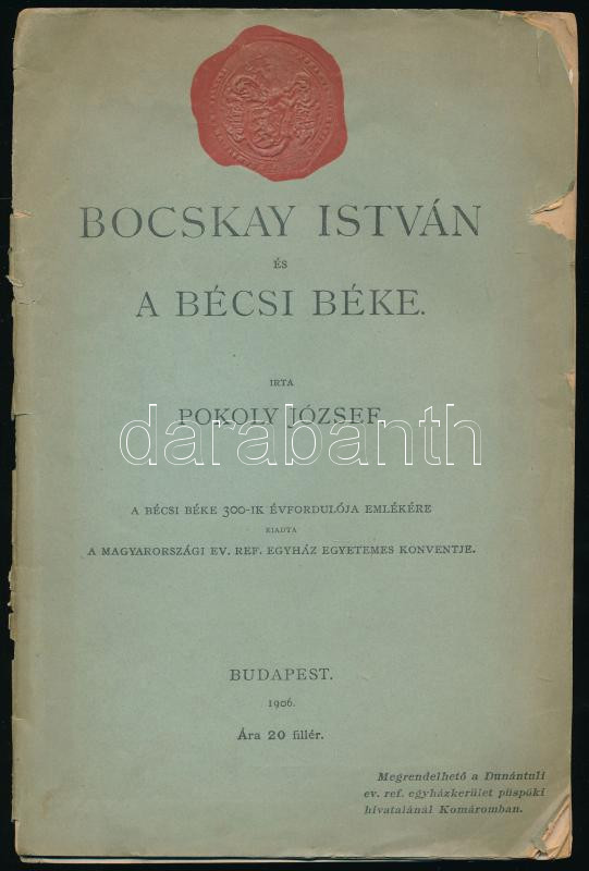 Pokoly József: Bocskay István és a bécsi béke. Bp, 1906, Franklin, 1 t.+32 p.+1 t. Kiadói papÃrkötés, sérült, hiányos borÃtóval, az elülsÅ‘ borÃtó és a cÃmkép szélén kis sérüléssel, hiánytalan, de szétesÅ‘ állapotban.