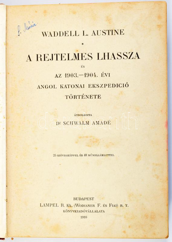 Leírás: Waddel L. Austine: A rejtelmes Lhassza, Az 1903.-1904. évi angol katonai ekszpedíció története. Átdolgozta : Dr. Schwalm Amadé. Bp. 1910. Lampel. Szövegközti képekkel. Festett, aranyozott, kopott kiadói egészvászon kötésben. Néhány oldal foltos