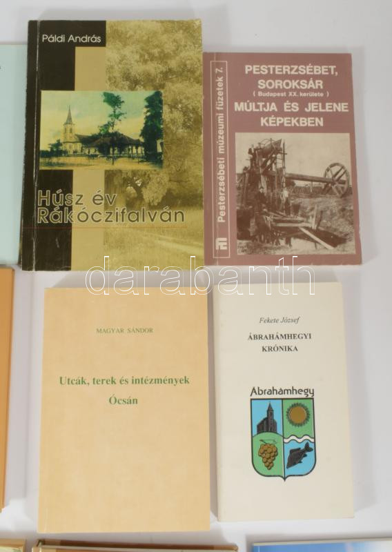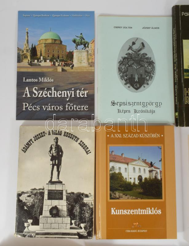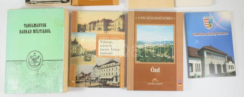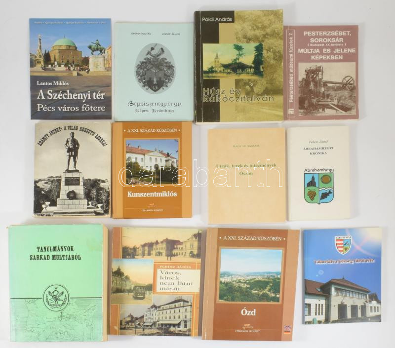 12 db vegyes helytörténeti könyv és kiadvány: Ádámfy József: A világ Kossuth szobrai.; Fekete József: Ábrahámhegyi krónika.; Páldi András: Húsz év Rákóczifalván.; Cserey Zoltán - József Álmos: Sepsiszentgyörgy képes krónikája.; stb. Változó állapotban