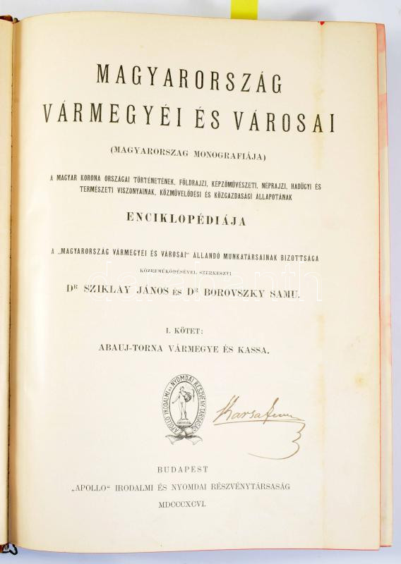 Abauj-Torna vármegye és Kassa. Szerk.: Dr. Sziklay János és Dr. Borovszky Samu. Magyarország vármegyéi és városai. (Magyarország monográfiája.) I. kötet. Bp., 1896, "Apollo" Irodalmi és Nyomdai Rt. (Légrády-ny.), 579+[3] p. + 13 (részben színes) t.+ 2 (kihajtható térképek) t. Gazdag szövegközti és egészoldalas képanyaggal illusztrálva. Kiadói aranyozott, festett, dombornyomott egészvászon-kötés, festett lapélekkel, jó állapotban. A címlapon szentkirályszabadjai Karsa Ferenc (1827-1915) 1848-as honvéd hadnagy, Görgey Artúr parancsőrtisztje, árvaszéki elnök névbejegyzésével.