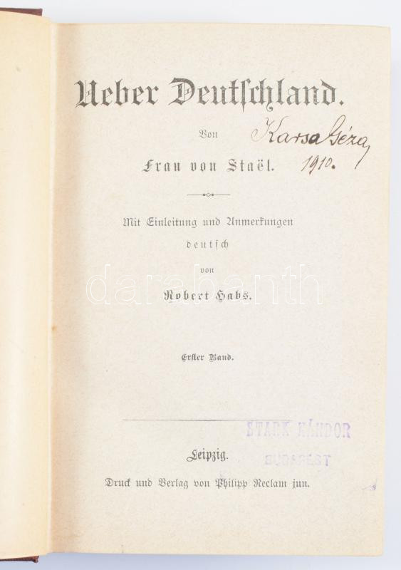 [Anne-Louise-Germaine de Staël] Frau von Staël: Ueber Deutschland. Mit Einleitung und Anmerkungen deutsch von Robert Habs. I-II. köt. [Egybekötve.] Leipzig, é.n., Philipp Reclam jun., 484 p.; 436 p. Német nyelven. Félvászon-kötésben, jó állapotban, tulajdonosi névbejegyzéssel.