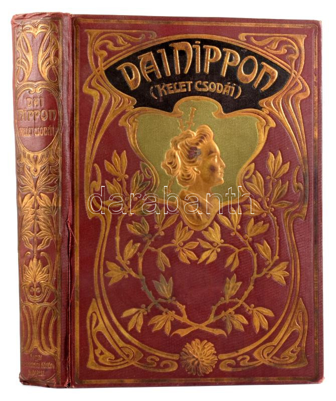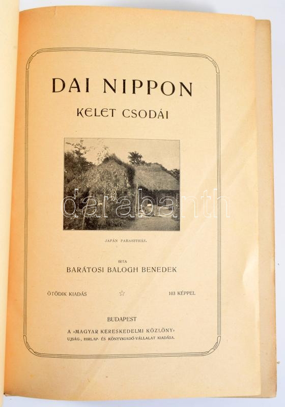 Barátosi-Balogh Benedek: Dai Nippon. Kelet csodái. Bp., [1906], Magyar Kereskedelmi Közlöny, 472+[8] p. Kiadói aranyozott, dombornyomott, szecessziós egészvászon-kötés, sérült gerinccel, kissé sérült fűzéssel.
