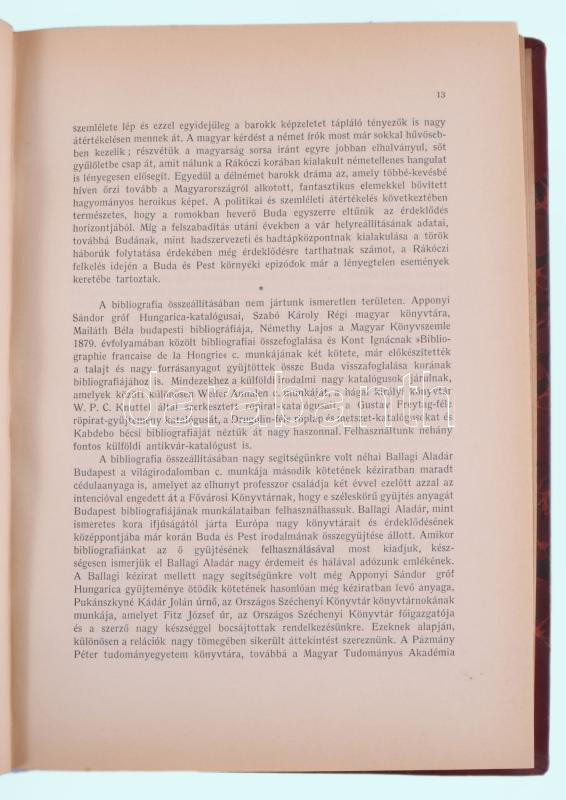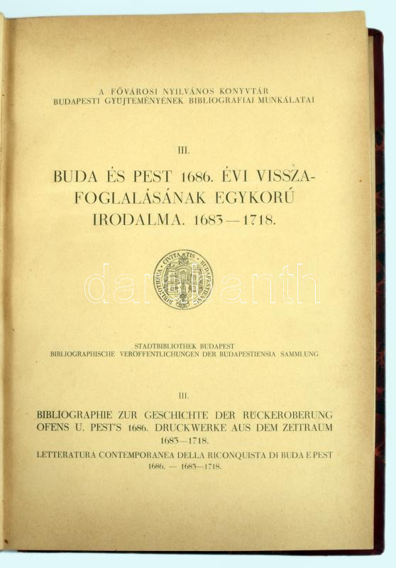 Buda és Pest 1686. évi visszafoglalásának egykorú irodalma. 1683 - 1718. (Bibliográfia). (Bp. 1936. Fővárosi Könyvtár). 190 l. A Fővárosi Nyilvános Könyvtár Budapest Gyűjteményének bibliográfiai munkálatai. III. aranyozott félbőr kötésben, gerincen sérüléssel