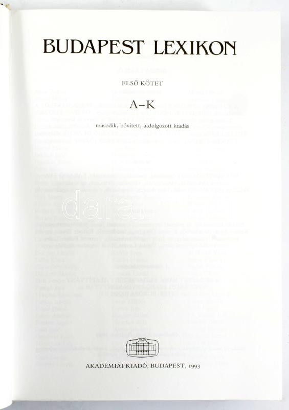 Budapest Lexikon. I-II. köt. (A-K; L-Z). Bp., 1993, Akadémiai Kiadó. Második, bÅ‘vÃtett, átdolgozott kiadás. Szövegközti képekkel gazdagon illusztrálva. Kiadói egészvászon-kötés, kiadói papÃr védÅ‘borÃtóban. + 1993 Budapest térképe (új utcanevekkel), Bp., Kartográfiai Vállalat, 80x116 cm
