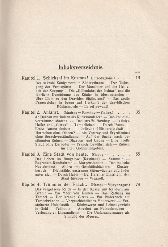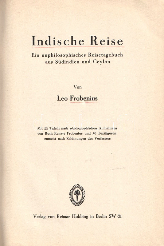 Leo Frobenius (1873-1938) német régész, etnológus és utazó, a kulturális morfológia elméletének kidolgozója, a vezető német etnológiai intézet, a Forschungsinstitut für Kulturmorphologie alapítója. Bár Frobenius elsősorban a nyugat-afrikai kultúrákat kutatta (a kontinenst 14 alkalommal látogatta meg), ez a kötete egy indiai antropológiai kutatóút beszámolója, oldalszámozáson belül térképvázlatokkal és antropológiai ábrákkal. A szerző a beszámoló bevételét antropológiai intézete javára ajánlotta fel.