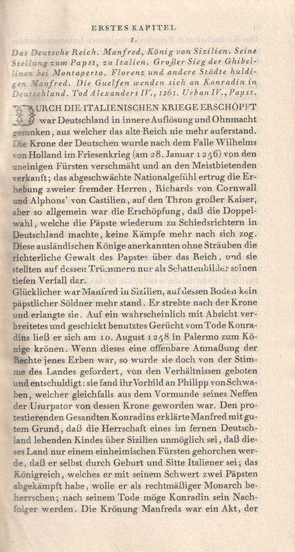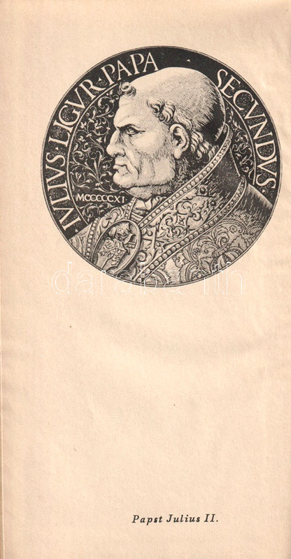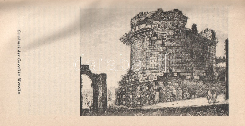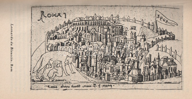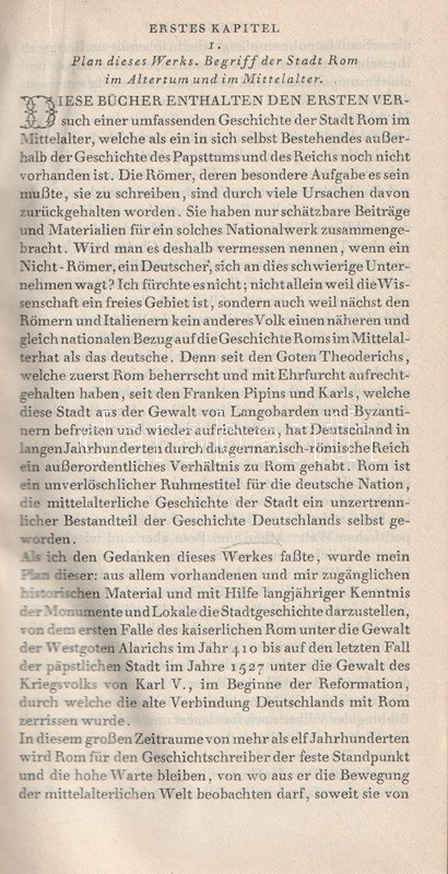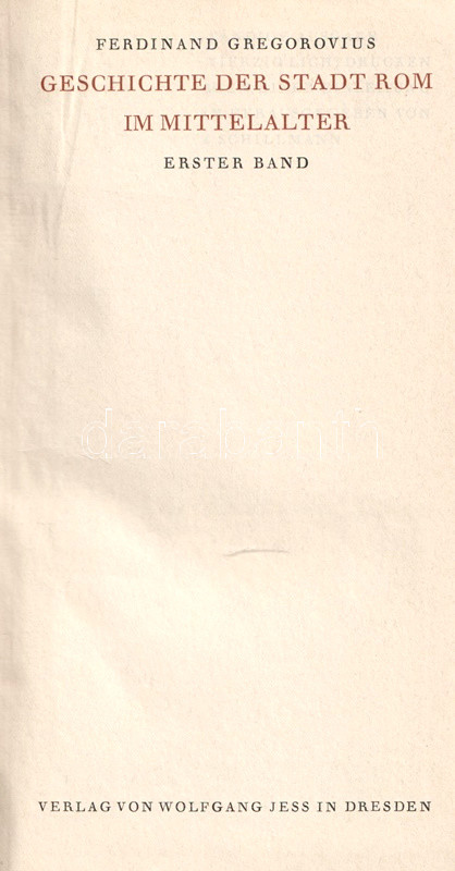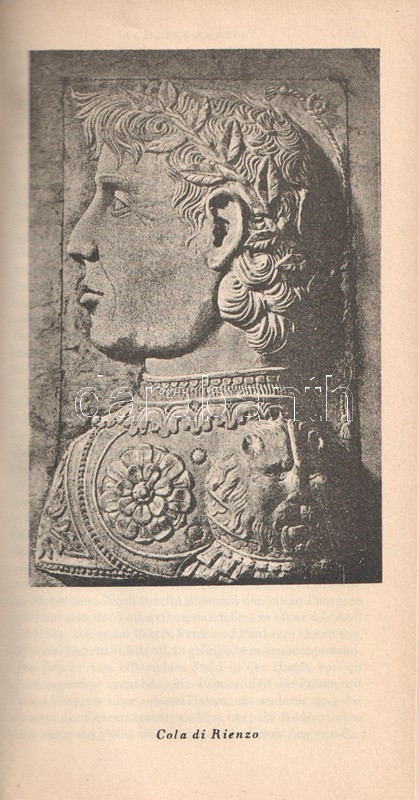Ferdinand Gregorovius (1821-1891) német történész, művelődéstörténész, Itália-kutató. Szépírói erényekkel megírt Róma-monográfiája élete fő műve, mely az örök város 476 és 1534 közötti: népvándorláskori, középkori és reneszánsz időszakának állít emléket. A politika- és társadalomtörténeti fókusszal megírt mű (az itt székelő katolikus egyházfő miatt) értelemszerűen kitekint a császárság és pápaság konfliktusára is, a zsoldosvezérek feltűnésével Róma és Itália más részeinek bonyolult viszonya is elemzés tárgyává lesz, olykor pedig kitér a városon belüli, alkalmasint patríciusok vezette köznyugtalanságokra is. Az első kötet képanyagában a romba dőlt császárváros elmélkedésre késztető ábrázolásai dominálnak, a másodikban a reneszánsz Itália jelentős személyiségei vonulnak fel, Petrarcától Savonaroláig, a Mediciektől a Borgiákig, de találkozhatni az éppen aktuális pápák és császárok portréival is. A munka első kiadása 1859-1873 között, nyolc kötetben jelent meg, példányunk a Fritz Schillmann történész által szerkesztett, felújított kiadásból való.