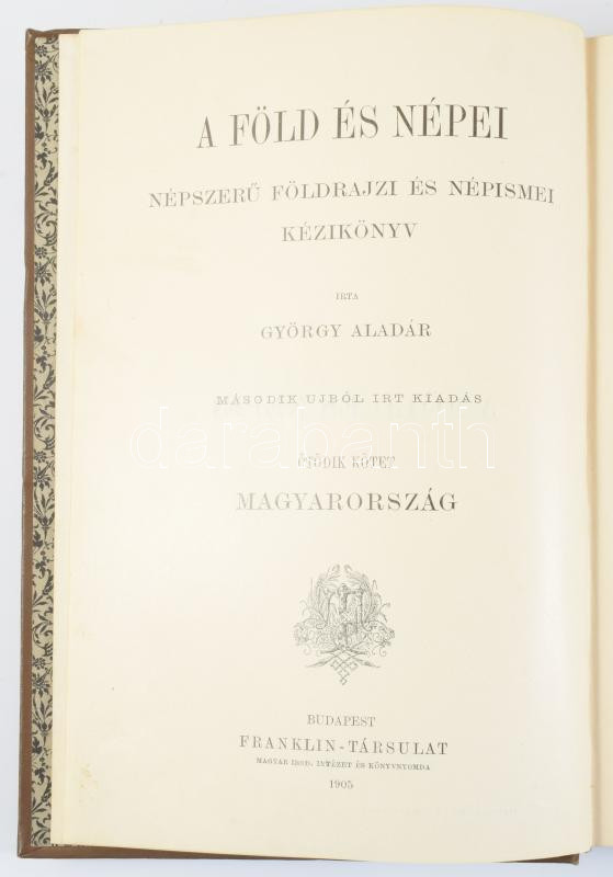 György Aladár (szerk.): A Föld és népei. Népszerű földrajzi és népismei kézikönyv. V. köt.: Magyarország. Bp., 1905, Franklin-Társulat, XIV+[2]+716 p.+ 32 (részben színes) t. Második kiadás. Szövegközti és egészoldalas képekkel gazdagon illusztrálva. Kiadói dekoratív, aranyozott egészvászon-kötés, jó állapotban. A címlapon szentkirályszabadjai Karsa Ferenc (1827-1915) 1848-as honvéd hadnagy, Görgey Artúr parancsőrtisztje, árvaszéki elnök névbejegyzésével.