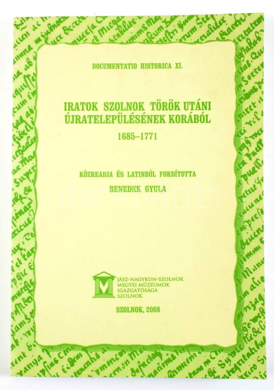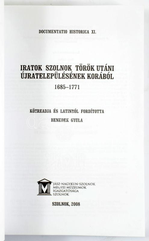 Iratok Szolnok török utáni újratelepülésének korából 1685-1771. Documantatio Historica XI. Közreadja és latinból fordította: Benedek Gyula. Szolnok, 2008. Kiadói papírkötés, jó állapotban.