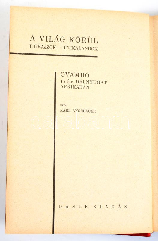 Karl Angebauer: Ovambo. 15 év Délnyugat-Afrikában. A világ körül - Útirajzok - útkalandok. Ford.: Szirmay Józsefné. Bp., (1931), Dante, 252 p.+16 (fekete-fehér fotók) t.+1 (egészoldalas térkép) t.