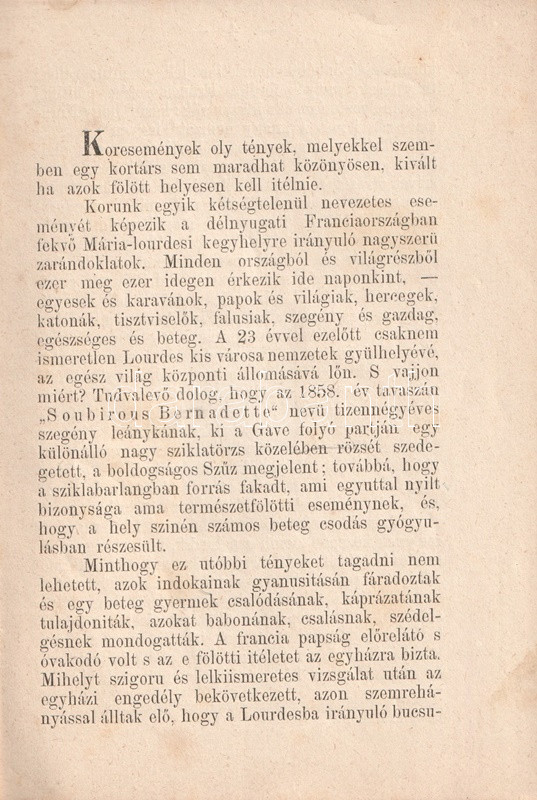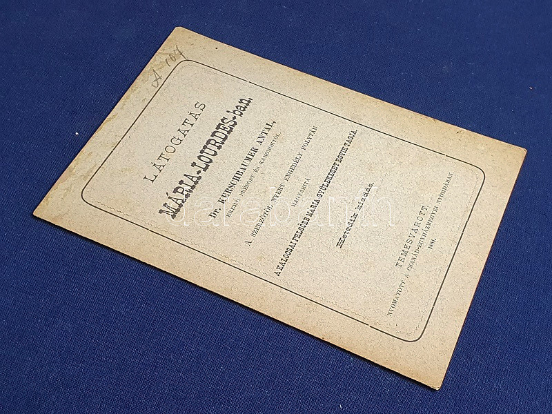 Anton Kerschbaumer (1823-1909) osztrák katolikus pap, teológus, prépost, egyházi író. Rövid írásában lourdes-i látogatásának tapasztalatait foglalja össze: a dél-franciaországi település 1858 óta számít katolikus zarándokhelynek. Példányunk a mű magyar fordításának hetedik lenyomatából való.