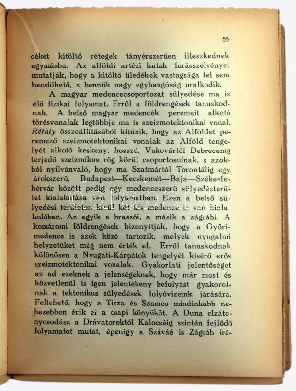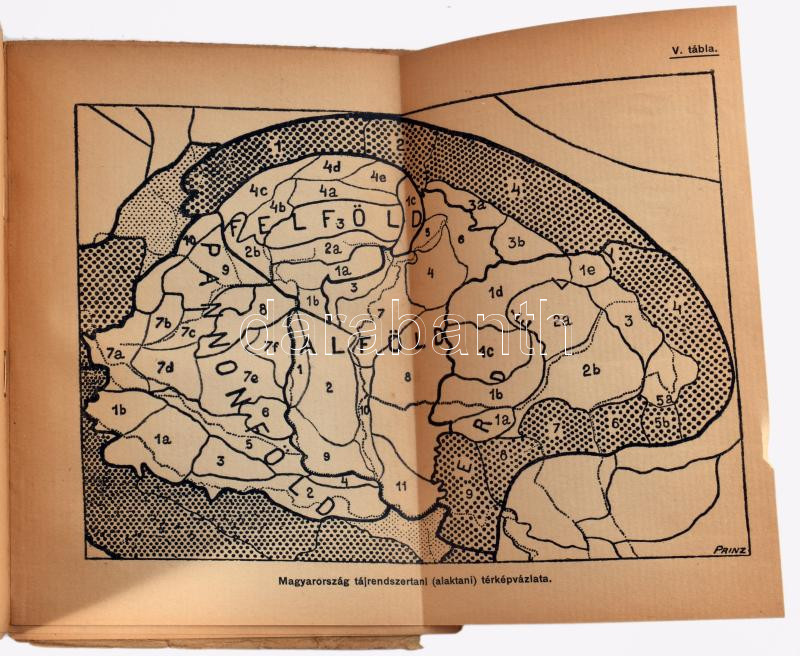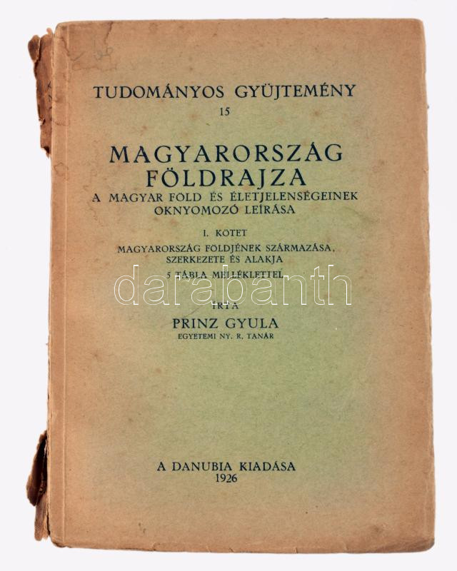 Prinz Gyula: Magyarország földrajza. A magyar föld és életjelenségeinek oknyomozó leírása. I. köt.: Magyarország földjének származása szerkezete és alakja. Tudományos Gyűjtemény 15. [Pécs], 1926., Danubia, [2]+202+[6] p. +5 (kihajtható térképek) t. Kiadói papírkötés, sérült gerinccel