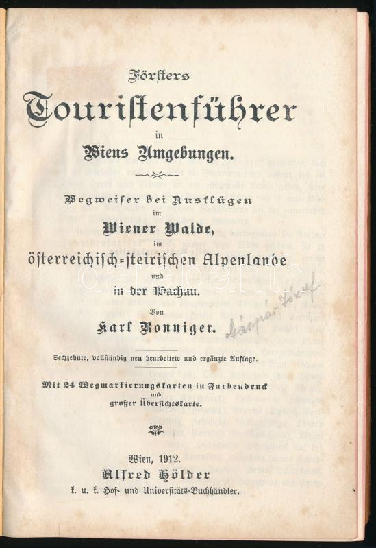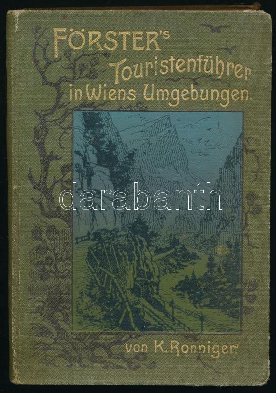 Ronniger, Karl: Försters Touristenführer in Wiens Umgebungen. Wegweiser bei Ausflügen im Wiener Walde, im österreichisch-steirischen Alpenlande und in der Wachau. Wien, 1912, Alfred Hölder, IX+[1]+450 p. Oldalszámozáson kívül számos térképpel. Német nyelven. Kiadói aranyozott egészvászon-kötés, helyenként kissé foltos lapokkal.
