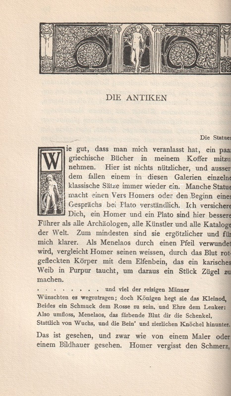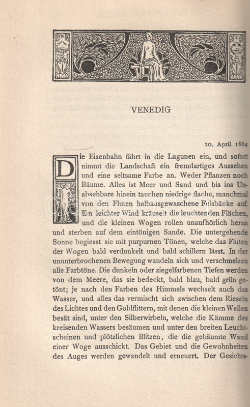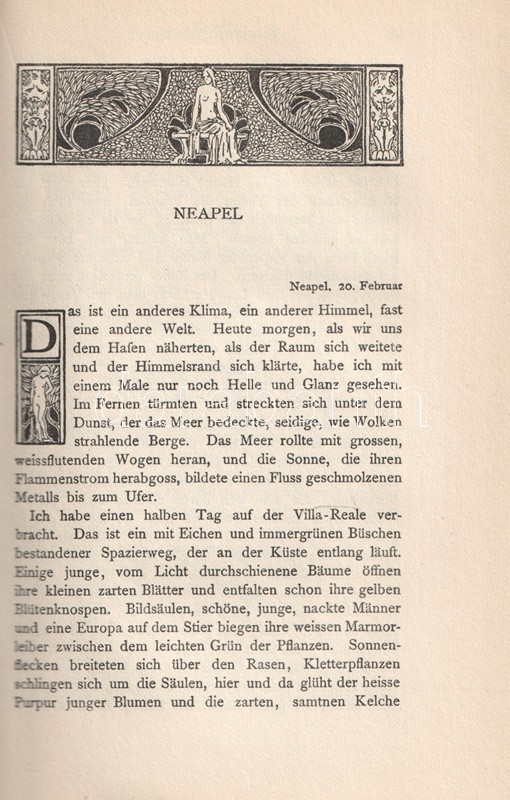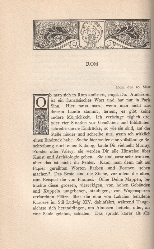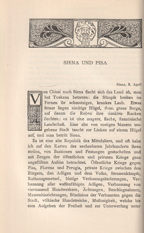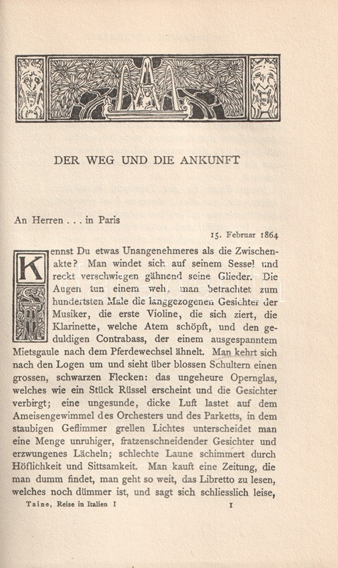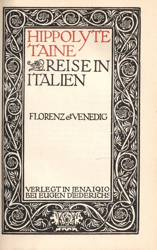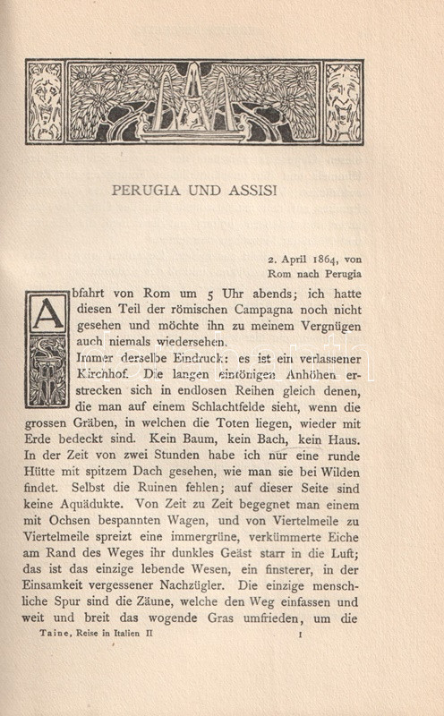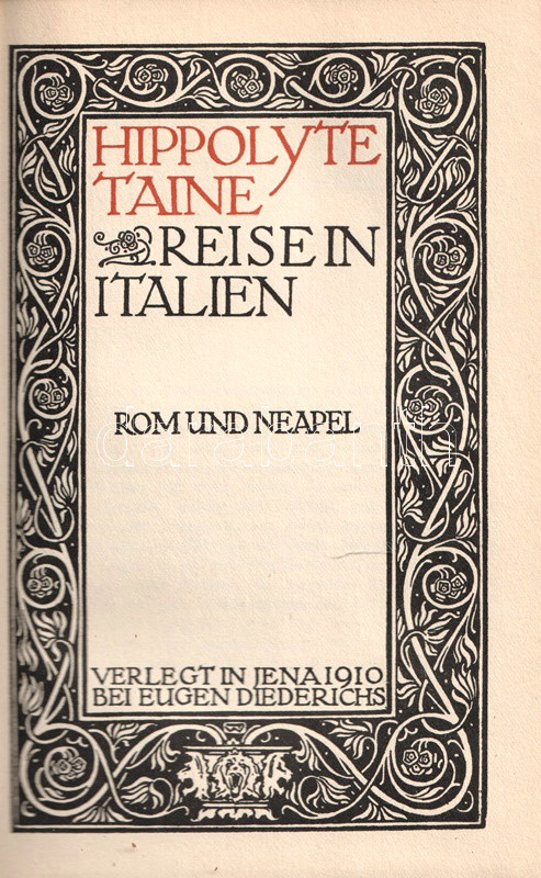 Hippolyte Taine (1828-1893) francia történész, kultúrtörténész, a pozitivista filozófia és irodalomtörténet meghatározó alakja. Eredeti nyelven először 1866-ban kiadott útírásában egy 1864. évi itáliai körutazás kulturális és képzőművészeti tapasztalatait teszi közzé. A munka német nyelven először 1904-ben jelent meg, a bibliofil Eugen Diederichs kiadó gondozásában, példányunk a mű 1910. évi újrakiadásból való.