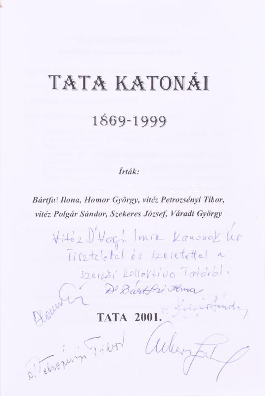 Tata katonái 1869-1999. A szerzők közül: Bártfai Ilona, Homor György, Petrozsényi Tibor, v. Polgár Sándor, Szekeres József által DEDIKÁLT példány. Tata, 2001, Tata Helyőrség Nyugállományúak Klubja, 413 p. Megjelent 1000 példányban. Kiadói papírkötés.