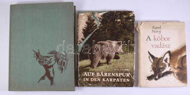 3 db könyv: Karel Novy: A kóbor vadász. Bratislava, 1969, Madách. Kiadói egészvászon-kötés, sérült kiadói papír védőborítóban. + V. J. Stanek: Auf Bärenspur in den Karpaten. Prága, 1959, Artia. Fekete-fehér fotókkal gazdagon illusztrálva. Német nyelven. Kiadói egészvászon-kötés, szakadt kiadói papír védőborítóban, ajándékozási bejegyzéssel. + Karel Hájek: Weidmannsheil! Prága, 1954, Artia. Német nyelven. Kiadói egészvászon-kötés.