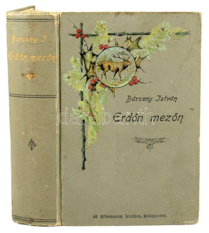Bársony István: Erdőn, mezőn. Természeti és vadászati képek. Kiváló magyar művészek eredeti rajzaival. Bp., [1900], Athenaeum, 2+IV+446 p. Második kiadás. Eredetileg sincsenek benne illusztrációk! Kiadói illusztrált, festett és aranyozott egészvászon-kötés, kopott borítóval, a hátsó táblán folttal. Bárcziházi Bárczy István (1882-1952) későbbi Budapesti főpolgármester beragasztott aláírásával.
