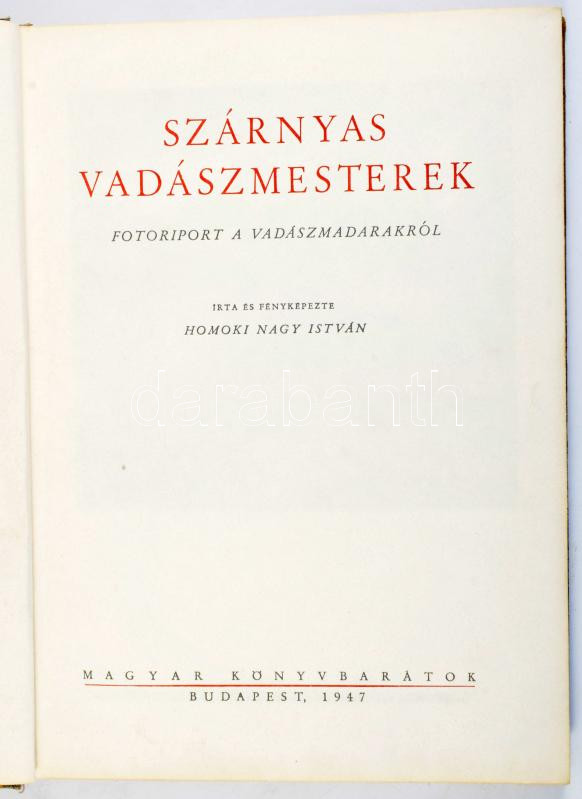 Homoki Nagy István: Szárnyas vadászmesterek. Fotóriport a vadászmadarakról. Írta és fényképezte - -. Bp.,1947., Országos Természettudományi Múzeum - Egyetemi Nyomda, 1 (címkép) t. + 61+3 p.+ 65 (egy színes, 64 kétoldalas) t. Egyetlen kiadás.
