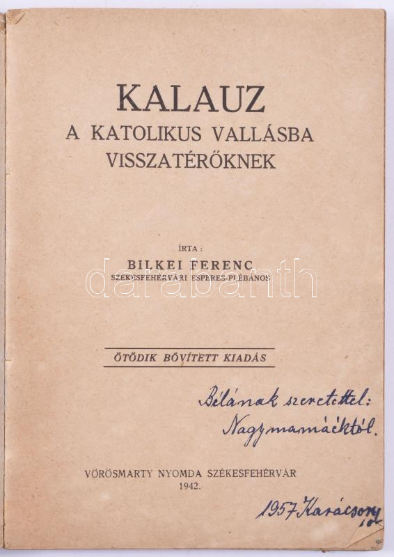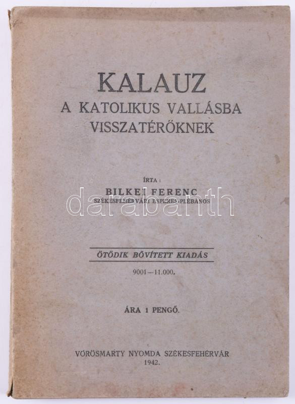 Bilkei Ferenc: Kalauz a katolikus vallásba visszatérőknek. Székesfehér... https://www.darabanth.com/hu/518-Filatelia-kepeslap-numizmatika-mutargy-konyv-papirregiseg-ekszer-aukcio/524.0/Konyvek/Konyvek-Vallas~131/Bilkei-Ferenc-Kalauz-a-katolikus-vallasba-visszateroknek-Szekesfehervar-1942-Vorosmarty~II3496456