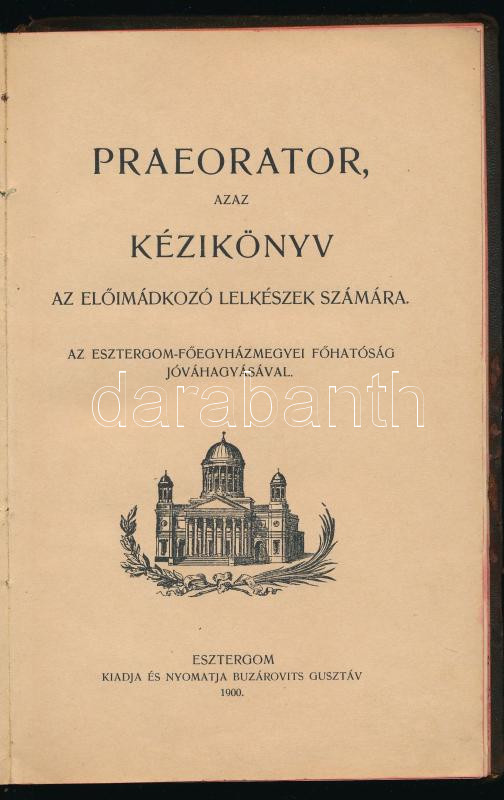 Leírás: Praeorator, azaz kézikönyv az előimádkozó lelkészek számára. Az Esztergom-Főegyházmegyei Főhatóság jóváhagyásával. Esztergom, 1900, Nuzárovits Gusztáv. Kiadói egészbőr kötés, gerinc sérült, színezett lapélek, kopottas állapotban.