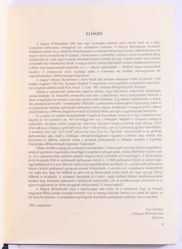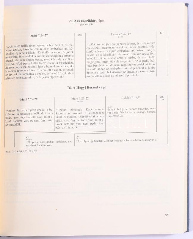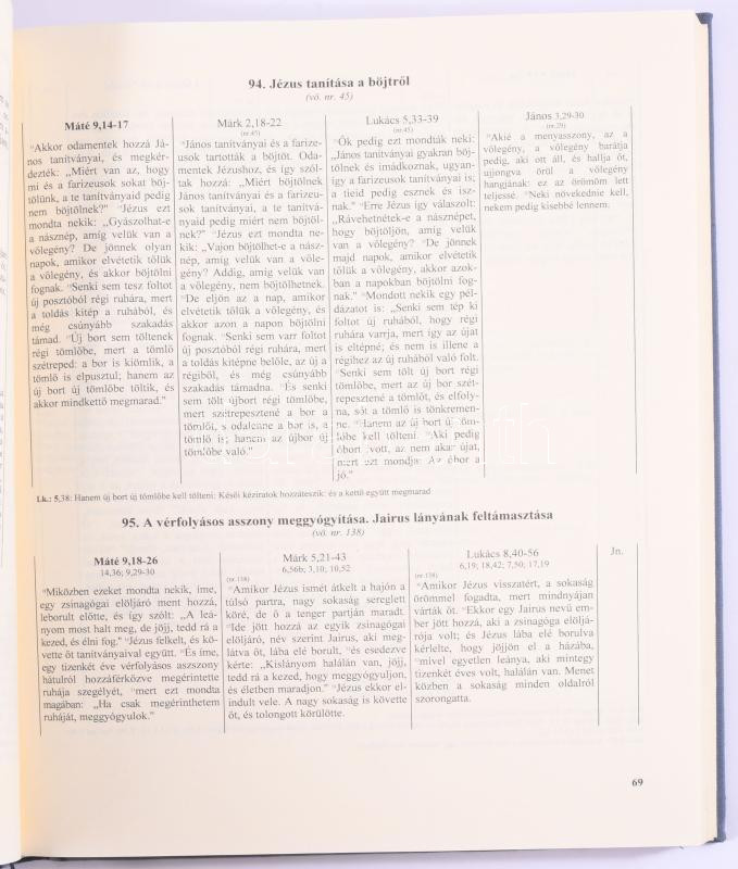 Leírás: Szinopszis. Máté, Márk, Lukács és János evangéliumának párhuzamos szövege. Bp., 1994, Kálvin János Kiadó, 314+[2] p. Kiadói egészvászon-kötés.