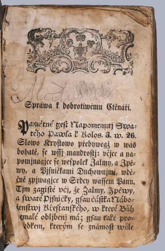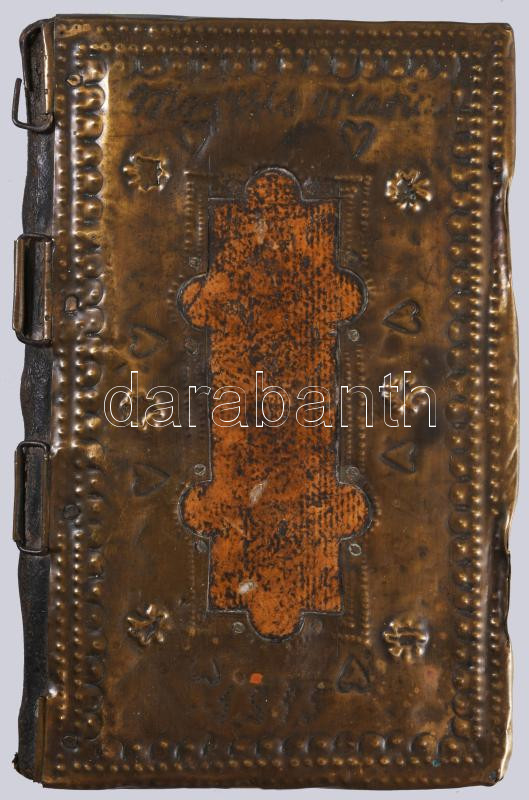 [Třanovský, Jiří (1597-1637): Cithara sanctorum: Pjsně Duchownj ...] Hozzákötve: Phiala sanctorum. Modlitby nábozné ze Swatého. Pjsma wybrané, a we wssech Potrebách... Hozzákötve: Phiala sanctorum. Modlitby nábozné ze Swatého. Pjsma wybrané, a we wssech Potrebách... Pest, 1858, Trattner-Károlyi,III-XIV+1184+[64];+237+3;+108 p. Szlovák nyelven. Egyházi kolligátumunk szlovák nyelvű énekes- és imádságoskönyv, melynek első, legnagyobb terjedelmű, nyitó munkája a tescheni születésű Jirzí Tranovsky (1591-1637), a "szláv Luther" evangélikus lelkész műve. Gyülekezeti énekeskönyve először 1636-ban jelent meg. A több mint 80 kiadást megélő énekeskönyv szövegei a századok során mélyen beivódtak a szláv kegyességi tudatba. Tranovsky műve a kiadások során folyamatosan bővült, kötetünk nyitómunkája 1040 rövidebb szöveget tartalmaz, utána a két rövidebb munka következik, önálló címlapokkal. Későbbi rézveretes félbőr-kötés, festett lapélekkel, a rézvereten "Mojzsis Maria" névvel és "1895" felirattal, kopott borítóval, hiányos rézveretekkel, kissé sérült kötéssel, hiányzó szennylapokkal, az első rész címlapja hiányzik, a végén néhány lapon gyűrődéssel.