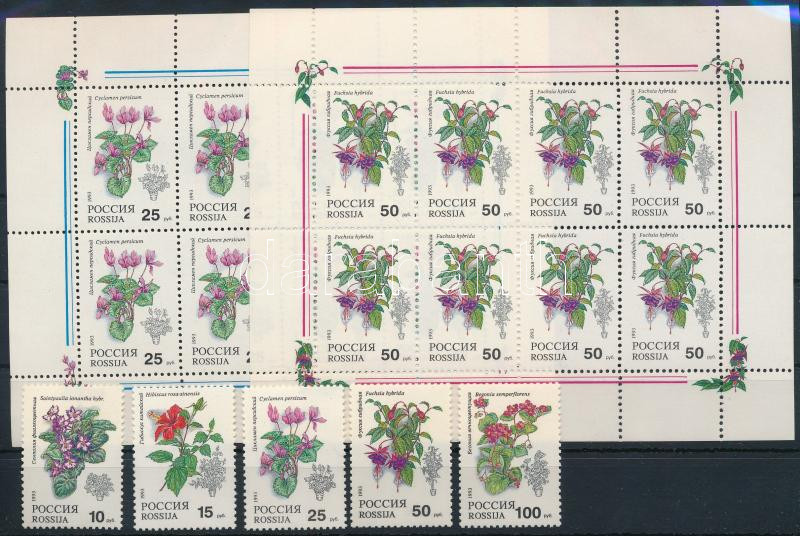 1993 Virágok Mi 296-300 + 2 kisív https://www.darabanth.com/hu/518-Filatelia-kepeslap-numizmatika-mutargy-konyv-papirregiseg-ekszer-aukcio/524.0/Kulfoldi-filatelia-es-postatortenet/Oroszorszag~1104/1993-Viragok-Mi-296-300-plus-2-kisiv~II3511545