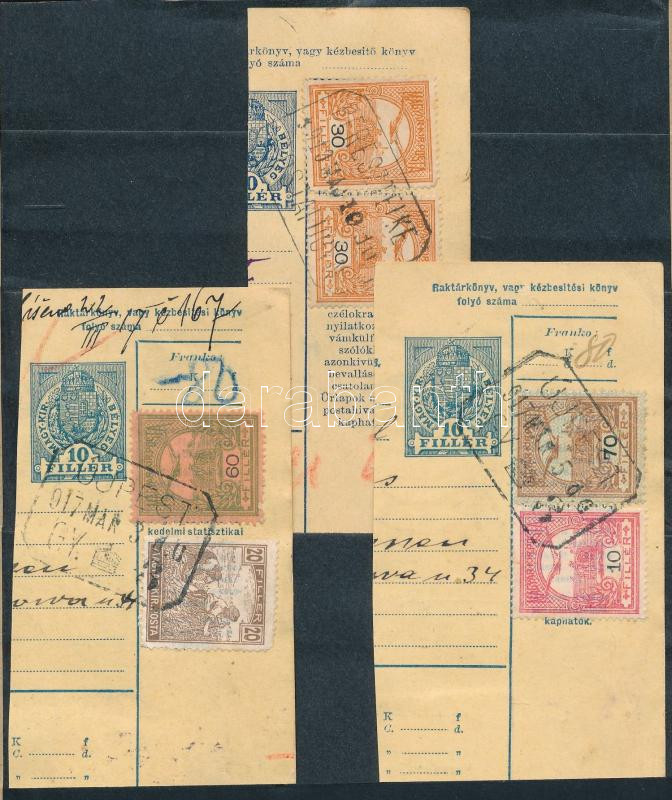 Leírás: 1910-1917 3 db csomagszállító szelvény: 2 "ÚJPEST", 1 "BERESZTELKE" postaügynökségi bélyegzéssel