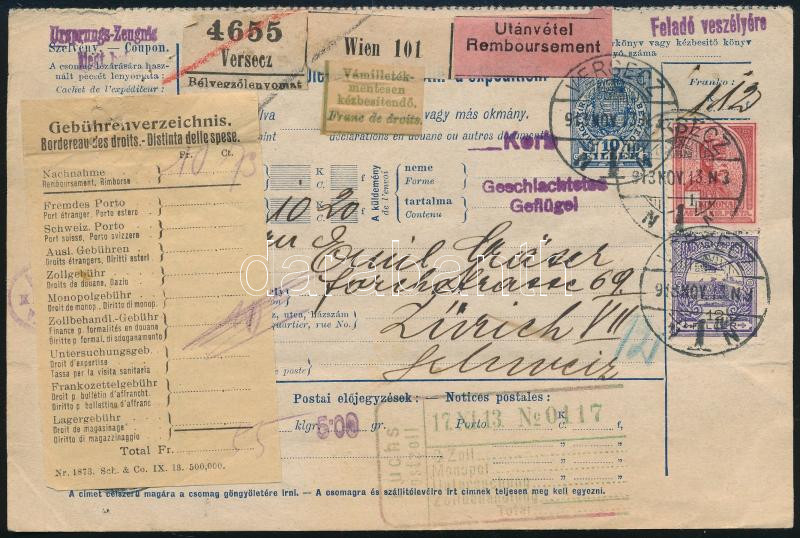 Leírás: 1913 november Utánvétes Csomagszállító, de vámmentes csomaghoz Turul 12f + 1K frankatúrával "VERSECZ" - Zürich (Svájc)