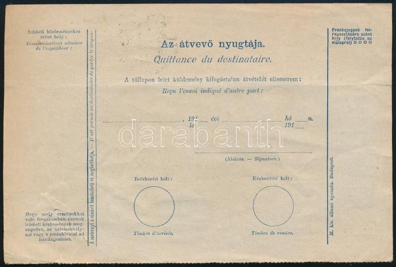 1913 november Utánvétes Csomagszállító, de vámmentes csomaghoz Turul 1... https://www.darabanth.com/hu/518-Filatelia-kepeslap-numizmatika-mutargy-konyv-papirregiseg-ekszer-aukcio/524.0/Magyar-filatelia-es-postatortenet/1900-1919-kozotti-kiadasok~33/1913-november-Utanvetes-Csomagszallito-de-vammentes-csomaghoz-Turul-12f-plus-1K-frankaturaval~II3512746